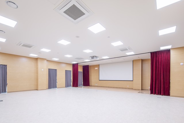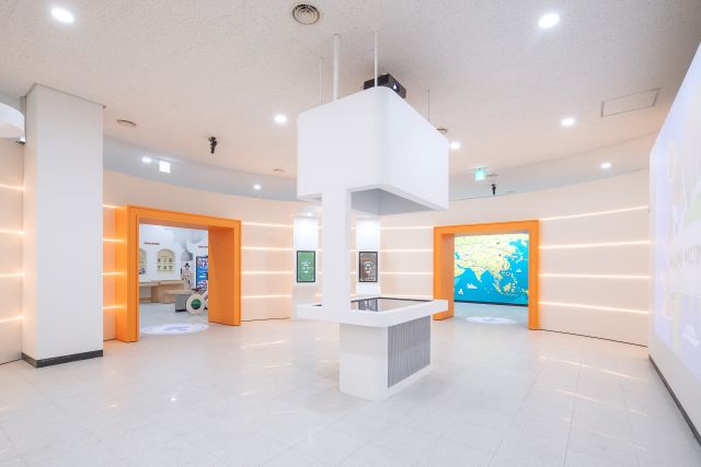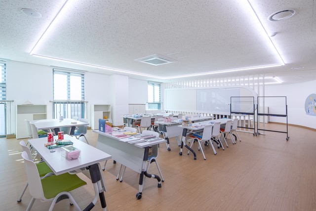 전면의 비워진 커다란 창은 학생들이 다양한 문화 체험을 통해 넓은 시야를 가지고 글로벌하게 성장하는 의미를 상징합니다.