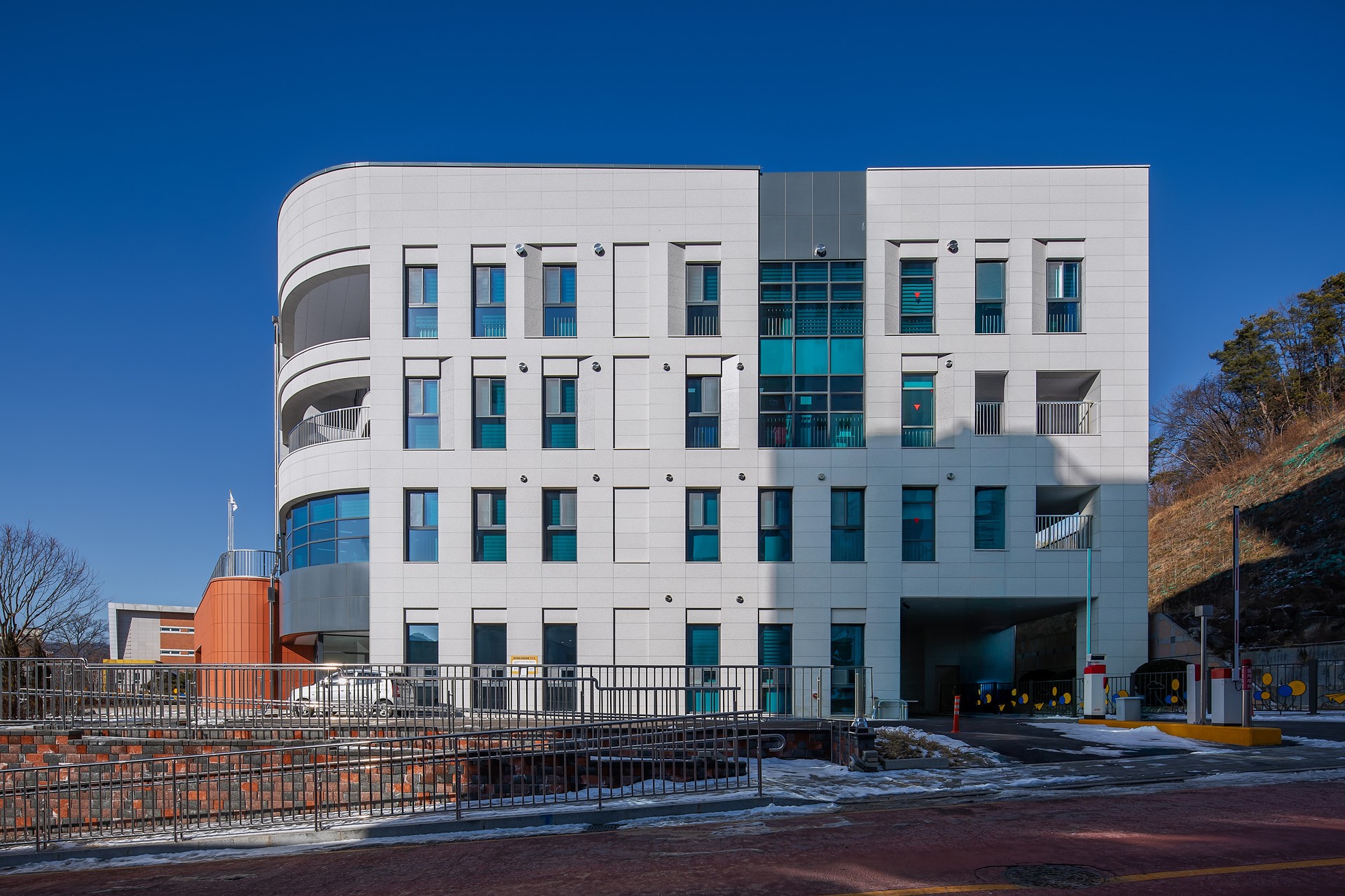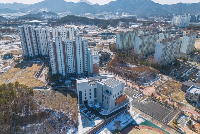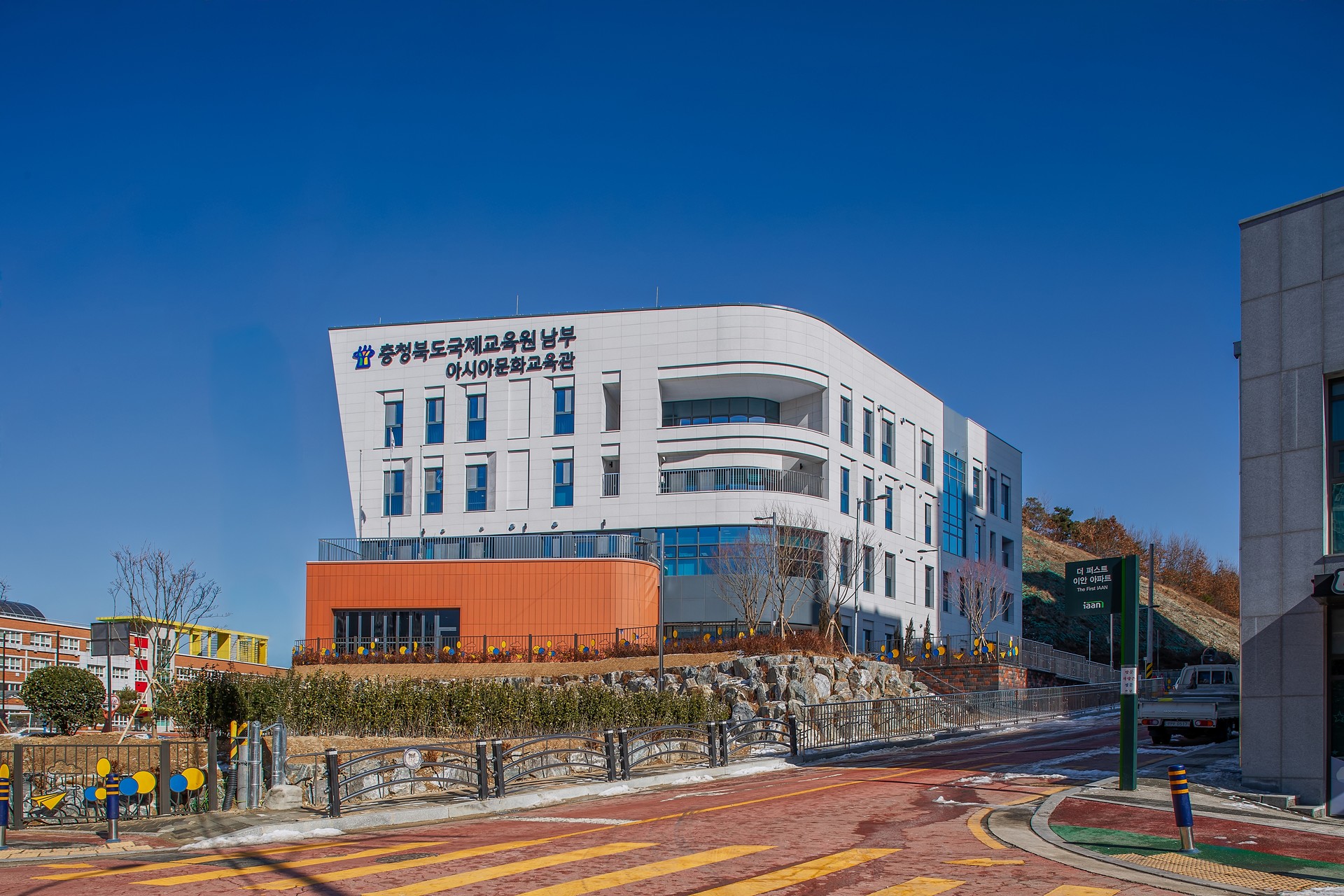 충청북도국제교육원은 국제환경 변화 및 다문화 사회 요구를 반영한 미래교육을 위해 충정북도 남부권역에 이전하여 신축하는 프로젝트로 사업부지 북측의 학교와 남측의 주거시설을 고려하고 이형의 경사 부지에 조화로운 배치가 요구되었습니다.